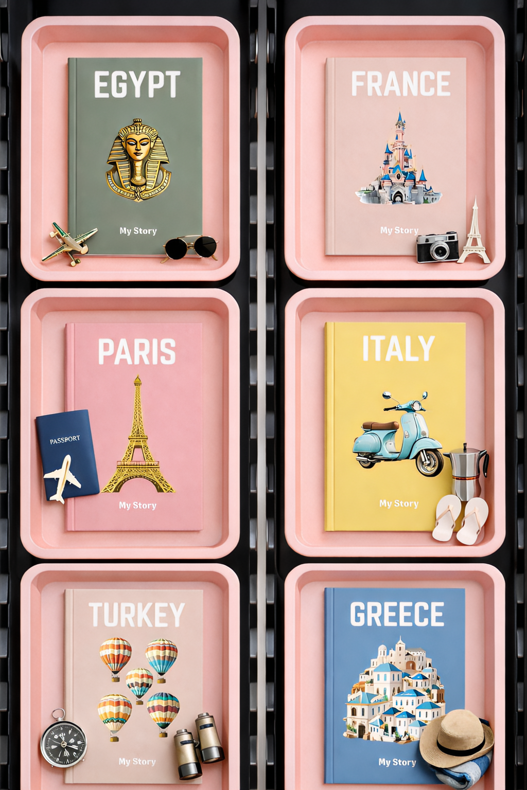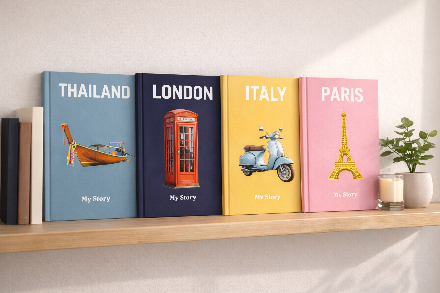Minimalistinis dizainas, įkvėptas tavo mėgstamiausių šalių. Nuo Barselonos saulės iki Tailando pakrančių. Paverskite tai gražia tradicija, po kiekvienos kelionės – po naują knygą į lentyną, kurią norėsis vartyti vėl ir vėl.